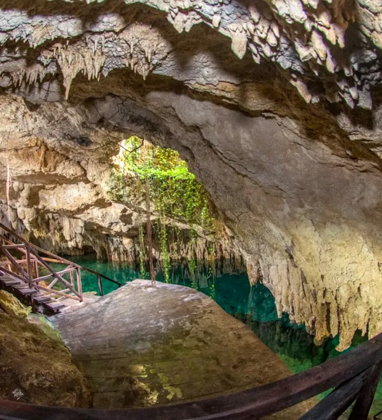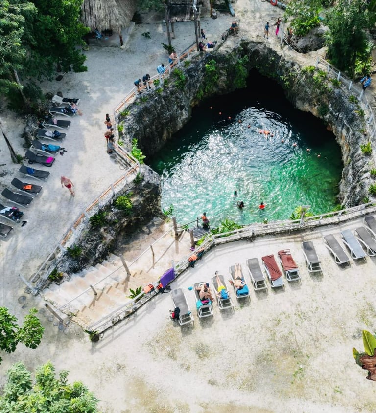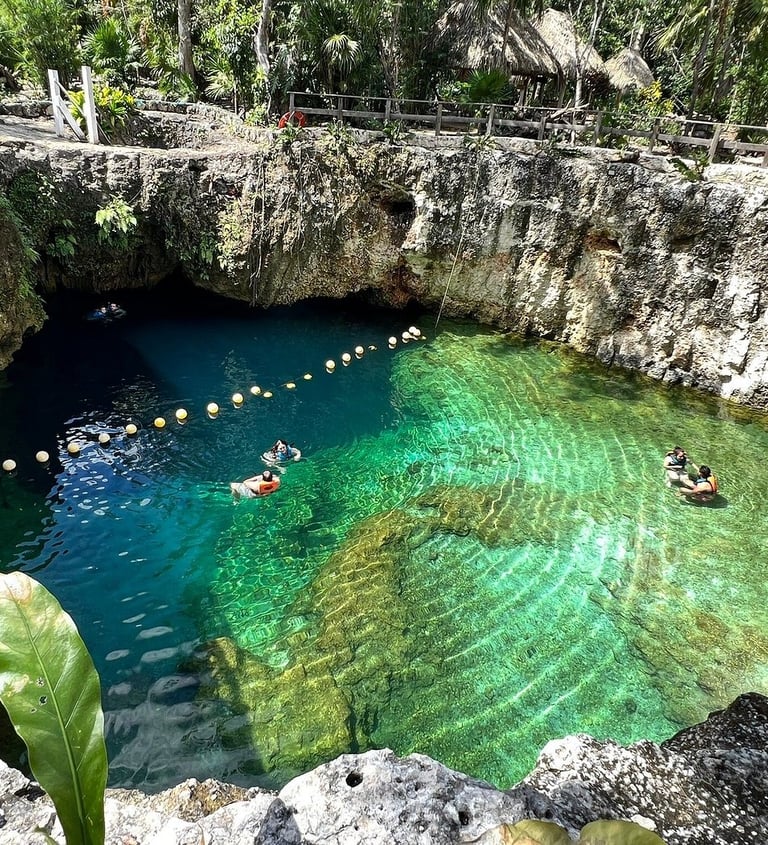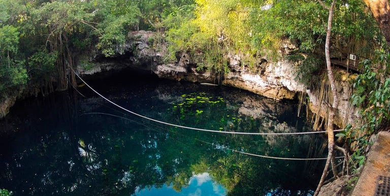 Un cenote abierto, rodeado de vegetación exuberante y con una tirolesa corta pero divertida. Es ideal para quienes prefieren la sensación de una "alberca natural" gigante bajo el sol.